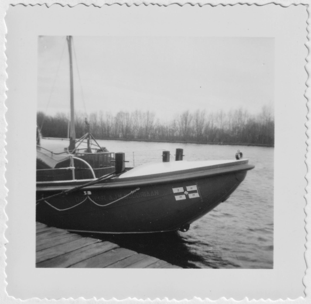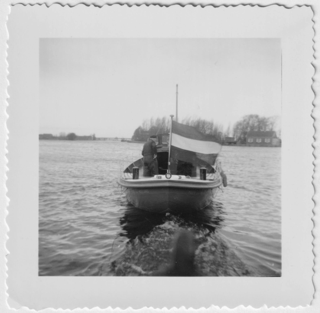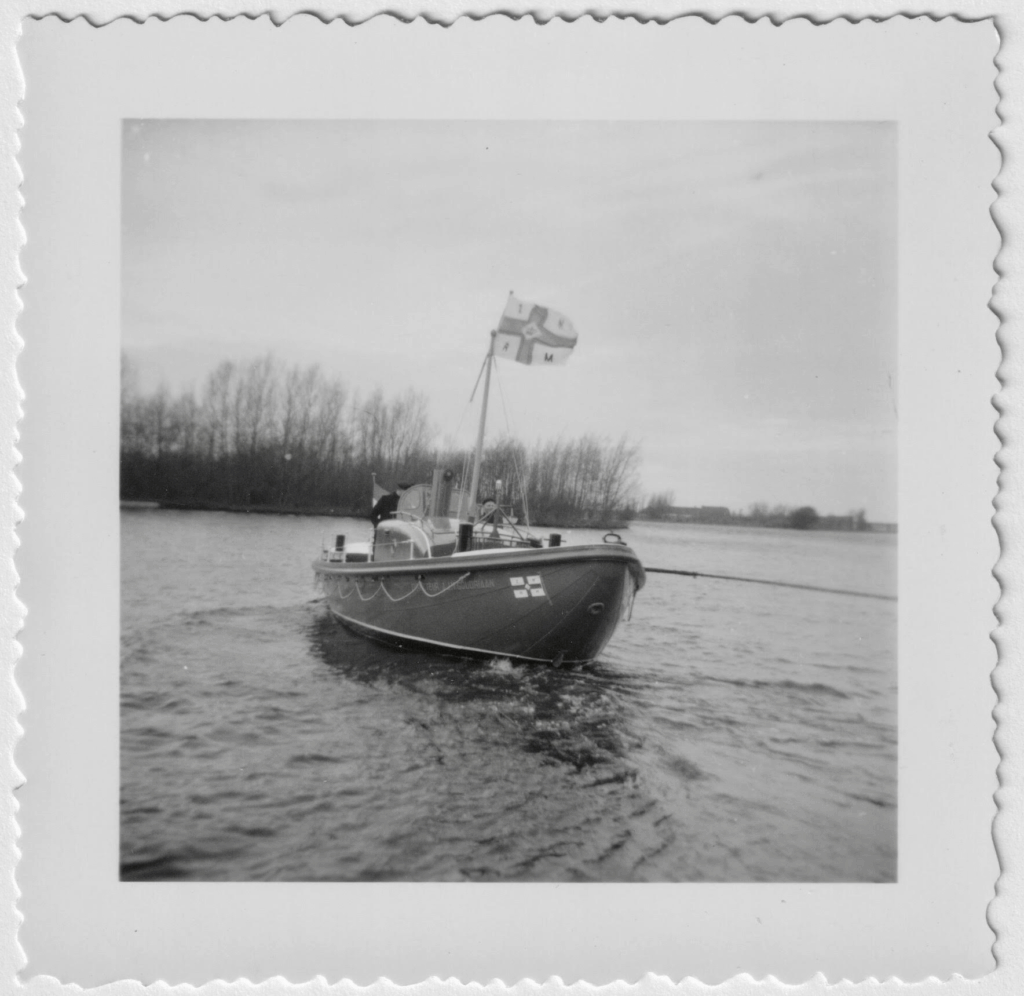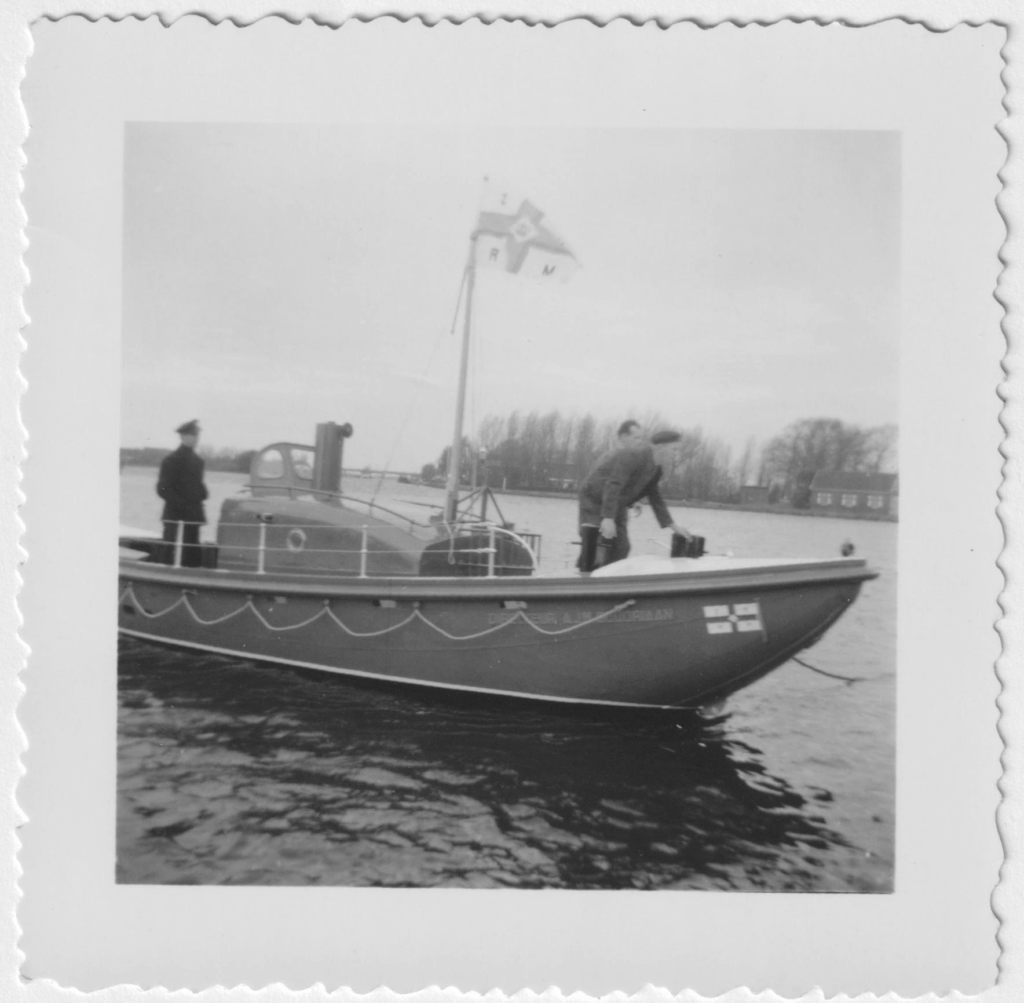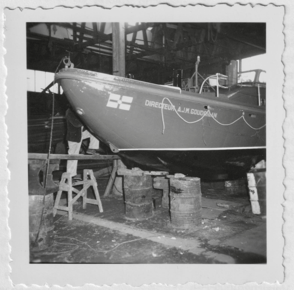 Het was een koude dag, gezien de kleding van de personen en de ijspegels op diverse plaatsen, alsmede ijzel op de kajuit. Dit is de oeruitvoering van deze boot. In het gezelschap staan mensen uit de directie en Raad van Beheer van dat moment, waaronder ook de heer A.W. Goudriaan als opvolger directeur. Het gebouw op de achtergrond is van de Koninklijke Roei- en Zeilvereniging, waar de familie Goudriaan lid van waren.